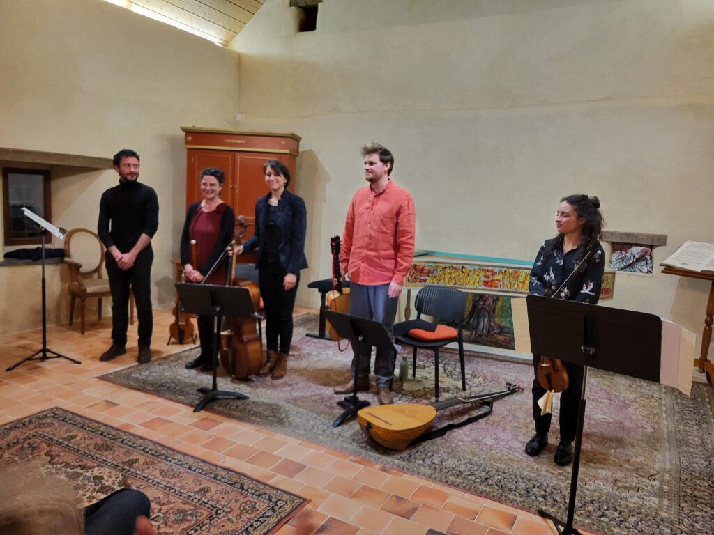 L’Ensemble Alçyone réunit depuis 2022 ces musiciens et musiciennes rennaises passionnées de musiques anciennes, dans un instrumentarium baroque qui varie au gré des programmes. Ce samedi soir, les 5 musiciens ont fait place à la musique italienne et nous ont plongé à l’orée de l’époque baroque avec des compositeurs tels que Frescobaldi, Caccini ou encore Kapsberger, que Corelli, le plus tardif, viendra compléter. Une instrumentation changeante et une ambiance intimiste et chaleureuse, voilà ce que nous ont réservé ces artistes de talent au Manoir de Kerboutier ce 11 avril qui ont été « bissés » et abondement applaudis !
